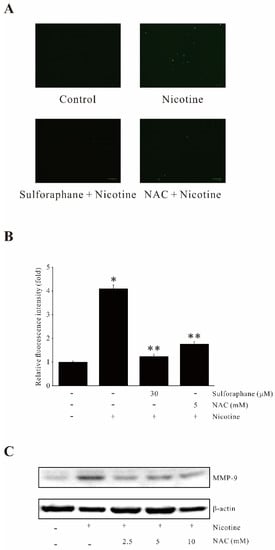 2.2. Sulforaphane Suppresses Nicotine-Induced MMP-9 Expression by Inhibiting ROS Generation