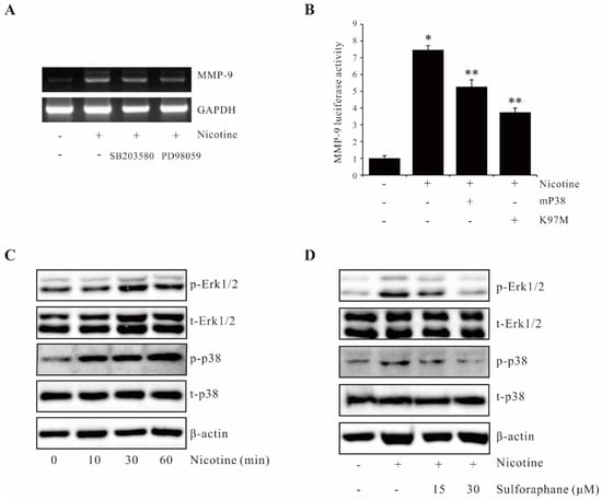 2.3. Sulforaphane Suppresses Nicotine-Induced MMP-9 Expression by Inhibiting p38 MAPK and Erk1/2 Activation