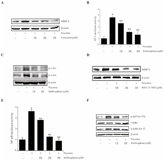 2.4. Sulforaphane Suppresses Nicotine-Induced MMP-9 Expression by Inhibiting Reporter Activities of AP-1 and NF-κB