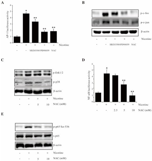 2.5. ROS/(p38 MAPK, Erk1/2) and ROS Functioned as Upstream Regulators of AP-1 and NF-κB Respectively
