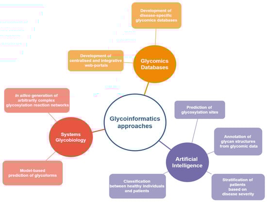 The need to formalise the analysis of glycans and integrate the glycomic data produced from a multitude of research efforts into dedicated databases and repositories that would facilitate their visual interpretation and the extraction of meaningful biological information is by no means a new idea [160]. In order to this end, significant progress has been made in recent decades in integrating not only glycomic data but also other omic data in curated databases and repositories [161,162,163,164]. These resources are based on information for numerous glycan structures, glycoproteins, glycosylation-relevant genes, and even glycan–protein interactions [162]. In order to facilitate pertinent research efforts, centralised and integrative web portals—incorporating multiple bioinformatic resources relevant to glycobiology—have been developed recently and are available to users. These portals are GlyGen [165] in the United States (https://www.glygen.org/ (accessed on 17 February 2022)), Glycomics@ExPASy [166] in Europe (https://www.expasy.org/search/glycomics (accessed on 17 February 2022)), and GlyCosmos [167] in Japan (https://glycosmos.org/ (accessed on 17 February 2022)). The systematisation of such information is a decisive step towards establishing the study of glycans as an integral part of biology and immunology. However, distinguishing which pieces of information need to be extracted from various databases and repositories in order to gain insight into glycan-based biomarker research might be cumbersome, and would inevitably require a strong background in glycobiology. This would potentially hamper the immediate adoption of such biomarkers by clinicians. This issue is exacerbated by the minimal existence of disease-specific glycomic databases. An important exemption is GlyConnect (https://glyconnect.expasy.org/ (accessed on 17 February 2022)), which is a Glycomics@ExPASy integrated platform that allows the collection, monitoring, and visualisation of glycobiological data, with a particular focus on the characterisation of the molecular components associated with protein glycosylation [168]. Different data types are available in GlyConnect, and can be accessed under specific categories, one of which is ‘Diseases’. Information about glycan types (e.g., N-linked, O-linked, free), as reported in pertinent scientific references, can be found for several diseases regarding different glycoproteins of interest, with the user also being given the option to focus on and explore glycan types regarding human IgG alone. Currently, with regard to the types of disease, great attention is being paid to different types of cancer, with N-linked glycans associated with different autoimmune diseases, mainly related to RA, SLE, and SS. The expansion of GlyConnect to include more references on already-existing entries for autoimmune diseases (e.g., RA, SLE, and SS), and to gather more data on other autoimmune diseases, would be an important step in the systematisation of glycobiological data for biomarker discovery in autoimmune diseases, while at the same time expediting the clinical translation of this field by helping clinicians without a relevant glycobiological background develop a better overview of the existing knowledge.