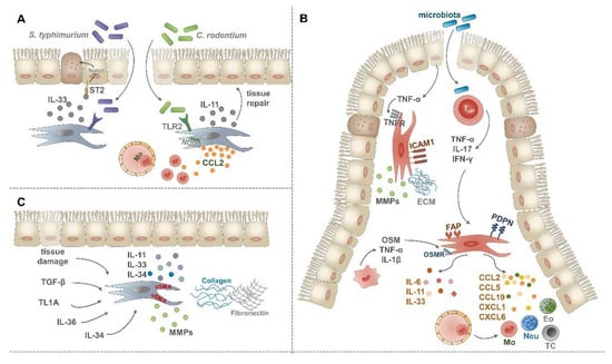 Role of IMCs upon intestinal inflammatory conditions. (A) Following infection with C. rodentium or S. typhimurium IMCs become activated. By the production of IL-11 and IL-33 pro-fibrogenic cytokines and CCL2 chemokine, they actively support tissue repair and the recruitment of inflammatory monocytes. (B) Fibrosis can be induced by dysregulated wound healing and a number of secreted factors, such as transforming growth factor-β (TGF-β), TL1A, IL-36, and IL-34. These mediators drive the accumulation and differentiation of αSMA+ myofibroblasts which then secrete excess ECM molecules and pro-fibrogenic cytokines. (C) Upon IBD, fibroblasts can be activated by TNF-α of epithelial origin, leading to their increased ICAM-1 expression and fibrogenic potential. Activated T cells can serve as another source of pro-inflammatory cytokines, such as TNF-α, IL-17, and IFN-γ, driving fibroblast activation. As a response, activated fibroblasts secrete pro-inflammatory and pro-fibrogenic cytokines, a vast array of chemokines, upregulate the expression of FAP and podoplanin and interact with macrophages via the OSM-OSMR axis.