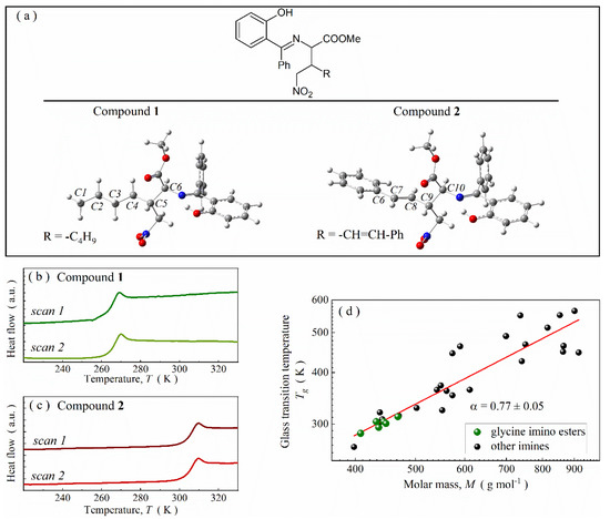 (a) The structure of glycine imino ester molecules of particular interest with labeled most crucial carbon atoms for conformational analysis. (b) Outcome of two subsequent calorimetric heating scans for compound 1. (c) Thermograms for compound 2. (d) Correlation between molar mass and glass transition temperature for imines.