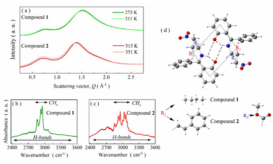 Apart from this difference, compounds 1 and 2 behave similarly in supercooled liquid and glassy states. This is particularly well reflected in XRD studies. Namely, the X-ray diffraction patterns of the studied melt-quenched compounds (Figure 2a) revealed that they form a supramolecular organization. The diffraction pre-peak appearing at ~0.75 Å−1 is an indicator of a medium-range intermolecular order. Actually, the collected diffractograms are very similar to those registered by us for other Schiff bases [21]. Following our previous report [21], the pre-peak’s origin may be ascribed to the organization of molecules in dimeric aggregates stabilized by BHBs. At higher temperatures, the XRD patterns do not change significantly compared to lower temperatures (Figure 2a) for both Schiff bases studied herein. In each case, the intensity of the main peak slightly decreases with the increase in temperature. It is the expected Debye-Waller effect, resulting from an increased thermal energy. In turn, the intensity of the pre-peak slightly increases with the increase in temperature for both Schiff bases. This behavior is not trivial, as the intensity of the pre-peak depends on both the amount and the architecture of the supramolecular clusters. The temperature-induced changes are greater for compound 2. Nevertheless, they are much smaller than those observed for other H-bonded self-organizing systems, e.g., numerous alcohols [37,38]. It suggests that there are only small temperature-induced changes in the architecture of the supramolecular structure going beyond the standard thermal effect for both Schiff bases in question. Therefore, one may assume that their supramolecular organization scheme is relatively stable at this temperature range.