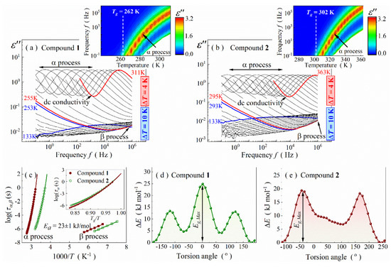 where R and Ea are gas constant and activation energy, respectively (Figure 3c). The latter parameter is equal to 23 ± 2 kJ∙mol−1 for both Schiff bases. Based on this information, one can easily find the ratio equal to 10.6 ± 0.9 and 9.2 ± 0.8 for compounds 1 and 2, respectively. These values are much lower than 24, which (following the theory of Kudlik et al. [48,49,50,51]) confirms intramolecular conformational changes as the β-relaxation origin. Indeed, conformational analysis performed by the quantum DFT method for the changeable substituent returned comparable energy barriers (Eg) with the experimental ones (c.f., Figure 3d,e with Table 1). However, due to structural complexity, we cannot exclude different mechanisms of conformational changes in both Schiff bases.