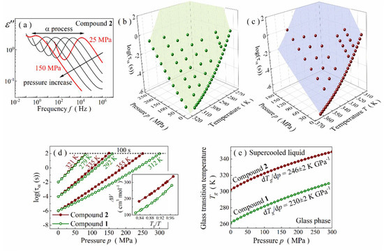 The pressure-induced time-scale changes in molecular dynamics are presented as a temperature-pressure surface of τα in Figure 4b,c. Ambient pressure alike, τα were calculated based on the relaxation peaks parametrization with HN function. The resultant p-T surfaces of τα are not flat for both Schiff bases and obey the Avramov model [52] (see Supplementary Material for more details). Therefore, the modified Avramov equation was used to obtain the thermal evolution of activation volume, ΔV and pressure dependence of Tg for each compound. The first parameter is defined for α-relaxation by the formula: