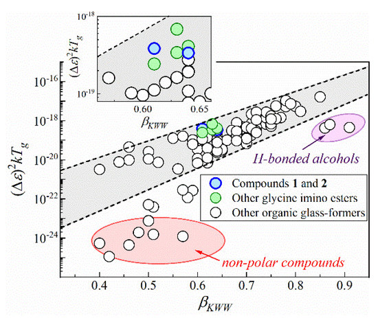 Atypically high values of dTg/dp coefficient force us to pose the question of whether hydrogen bonds are really the main interactions determining molecular dynamics and dielectric properties of glycine imino esters. In order to deliver an answer to this issue, we turn back to the ambient-pressure dielectric results. Based on them, we examine the fundamental relation between dielectric increment assessed near Tg (Δε(Tg)) and the frequency dispersion width of the α-relaxation loss peak, quantified by the fractional exponent in the Kohlrausch–Williams–Watts function (i.e., βKWW parameter) [60,61]. According to this empirical relationship, dielectric loss peak becomes narrower and βKWW rises when dielectric increment increases [61]. This peculiarity, apparent on the semilogarithmic plot of kTg(Δε(Tg))2 versus βKWW, remains valid only for polar van der Waals systems and fails mainly for nonpolar compounds or H-bonded liquids, e.g., alcohols (see Figure 5) [61,62]. Disagreement between Δε and βKWW among alcohols has been shown only for 4-phenyl-2-butanol, 4-phenyl-1-butanol and 1-phenyl-2-butanol so far [62].