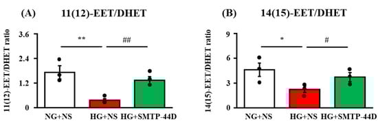 The ratio of 11(12)-EET/DHET (A) and 14(15)-EET/DHET (B) in response to SMTP-44D in IMS32 cells under high glucose conditions. IMS32 cells were incubated with SMTP-44D (30 μM) from 48 to 96 h after the HG treatment. The levels of EETs and DHETs were determined 96 h after the HG treatment. The data are expressed as the mean ± S. E. M. (n = 3). * p < 0.05, ** p < 0.01 vs. NG + NS group; #p < 0.05, ##p < 0.01 vs. HG + NS group by one-way analysis of variance followed by Bonferroni test. NG, normal glucose; HG, high glucose; NS, normal saline.