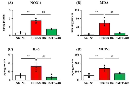 The levels of NOX-1, MDA as a measure of reactive oxygen species, IL-6, and MCP-1 were measured to evaluate the exacerbation of inflammation in IMS32 cells under high glucose conditions. Figure 3 summarizes the effects of SMTP-44D on the production of MDA in the lysate as assessed by the TBARS assay and on the expression of NOX-1 in the lysate as well as the production of IL-1β and IL-6 in the lysate as assessed by ELISA at 96 h. In the HG + NS group, the levels of NOX-1 (p < 0.01, 1.74 ± 0.22 ng/mg protein), MDA (p < 0.01, 58.9 ± 14.03 nmol/mg protein), IL-6 (p < 0.01, 49.02 ± 11.76 pg/mg protein), and MCP-1 (p < 0.01, 138.01 ± 19.04 ng/mg protein) were significantly increased as compared to those in the NG + NS group (0.29 ± 0.05 ng/mg protein; 2.86 ± 1.16 nmol/mg protein; 15.71 ± 3.34 pg/mg protein; and 54.80 ± 13.32 ng/mg protein, respectively). The HG + SMTP-44D (30 μM) treatment group showed significant decreases in the levels of NOX-1 (p < 0.01, 0.76 ± 0.04 ng/mg protein), MDA (p < 0.01, 11.29 ± 0.59 nmol/mg protein), IL-6 (p < 0.01, 9.66 ± 4.87 pg/mg protein), and MCP-1 (p < 0.01, 75.78 ± 2.09 ng/mg protein) compared to the HG + NS group.