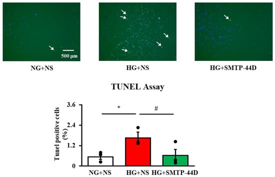 Evaluation of apoptosis in response to SMTP-44D in IMS32 cells under high glucose conditions. IMS32 cells were incubated with SMTP-44D (30 μM) from 48 to 96 h after the HG treatment. Apoptosis analysis by the TUNEL assay was performed 96 h after the HG treatment. Representative images of TUNEL-positive cells (green fluorescence) labeled with dUTP and nuclei (blue fluorescence) stained with DAPI solution are shown. White arrows indicate TUNEL-positive cells. The data are expressed as the mean ± S. E. M. (n = 3). * p < 0.05 vs. NG + NS group; #p < 0.05 vs. HG + NS group by one-way analysis of variance followed by Bonferroni test. NG, normal glucose; HG, high glucose; NS, normal saline.