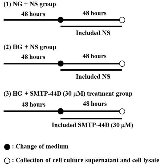When the cells reached approximately 90% confluency, the culture medium was replaced with serum-free DMEM supplemented with an N-2 supplement (Thermo Fisher Scientific K.K., Tokyo, Japan) containing normal glucose (5.6 mM; NG) or high glucose (30 mM; HG). IMS32 cells were incubated for 96 h under three different culture conditions: (1) NG + normal saline (NS) group; (2) NG + NS group; and (3) NG + SMTP-44D (30 μM) treatment group. The three different treatment conditions are shown in Figure 6.