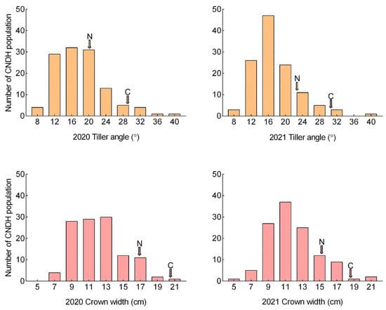 2.1. Phenotype Evaluation for Tiller Angle and Tiller Crown Width in CNDH Population