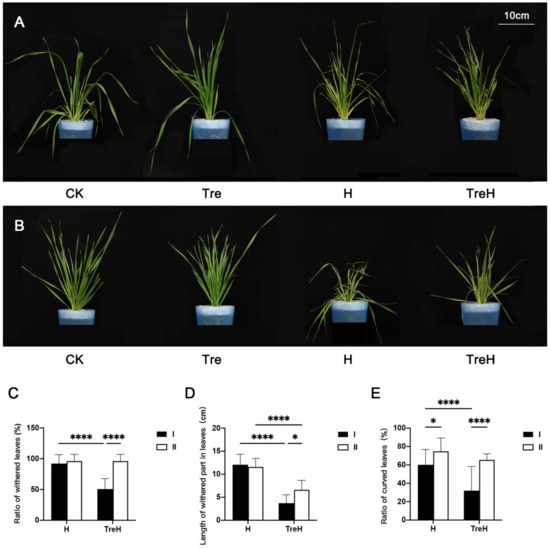 Phenotypic changes of wheat induced by exogenous trehalose under heat stress. (A) Yangmai 18. (B) Yannong 19. CK—control group; H—heat stress treatment for 24 h; Tre—trehalose pretreatment for 3 d; TreH—trehalose pretreatment for 3 d followed by high-temperature treatment for 24 h. A total of plants were randomly selected from each treatment group for taking photos. All the photos were taken soon after the high-temperature groups finished the heat-stress treatment. (C) The ratio of withered leaves in wheat seedlings. (D) Length of withered part in leaves. (E) The ratio of curved leaves in wheat seedlings. I—Yangmai 18; II—Yannong 19; H—heat stress treatment for 24 h; TreH—trehalose pretreatment for 3 d followed by high-temperature treatment for 24 h. Values are the means ± SDs (n = 3). * indicates a significant difference at 0.01 < p ≤ 0.05, **** indicates a significant difference at p ≤ 0.0001.
