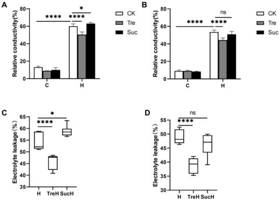 The relative electrical conductivity and electrolyte leakage of two varieties of wheat seedlings. (A,B) C—room temperature; H—high temperature; CK—control group; Tre—trehalose pretreatment group; Suc—sucrose pretreatment group; (C,D) H—high-temperature stress treatment for 24 h; TreH—trehalose pretreatment for 3 d followed by high temperature stress treatment for 24 h; SucH—sucrose pretreatment for 3 d followed by high temperature stress treatment for 24 h. (A,C) Yangmai 18. (B,D) Yannong 19. Values are the means ± SDs (n = 3). * indicates a significant difference at 0.01 < p ≤ 0.05, **** indicates a significant difference at p ≤ 0.0001, ns indicates no statistical difference.