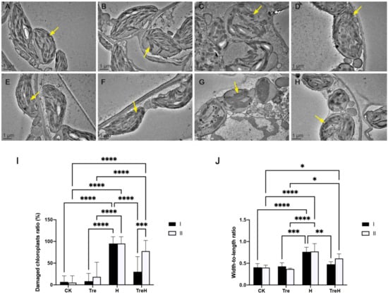 Chloroplast ultrastructure of two varieties of wheat (2500). (A) Yangmai 18 without trehalose at room temperature. (B) Yangmai 18 trehalose pretreatment group. (C) Yangmai 18 without trehalose at high temperature. (D) Yangmai 18 high temperature trehalose pretreatment group. (E) Yannong 19 without trehalose at room temperature. (F) Yannong 19 trehalose pretreatment group. (G) Yannong 19 without trehalose at high temperature. (H) Yannong 19 high-temperature trehalose pretreatment group. Yellow arrow—thylakoid. The images were taken by a transmission electron microscope. Scale bars = 1 μm. (I) Damaged chloroplasts ratio. (J) Width-to-length ratio of chloroplasts. I—Yangmai 18; II—Yannong 19; CK—control group; H—heat stress treatment for 24 h; Tre—trehalose pretreatment for 3 d; TreH—trehalose pretreatment for 3 d followed by high-temperature treatment for 24 h. Values are the means ± SDs (n = 3). * indicates a significant difference at 0.01 < p ≤ 0.05, ** indicates a significant difference at p ≤ 0.01, *** indicates a significant difference at p ≤ 0.001, **** indicates a significant difference at p ≤ 0.0001.