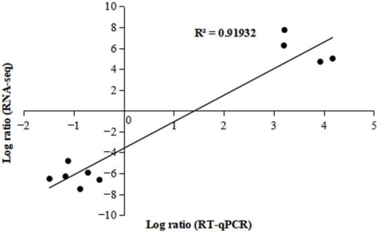 Validation of transcriptomic data (10 DEGs) RT-qPCR. Each black circle represents a gene.