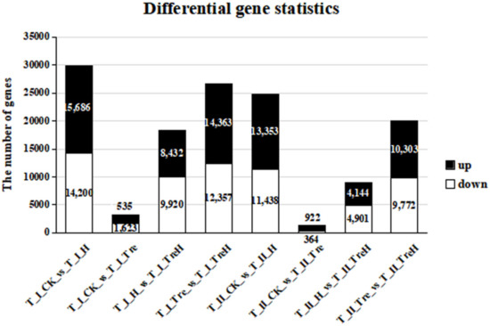 Differential gene statistics. T—the transcriptome; Ⅰ—Yangmai 18; Ⅱ—Yannong 19; CK—control group; H—heat stress treatment for 24 h; Tre—trehalose pretreatment for 3 d; TreH—trehalose pretreatment for 3 d followed by high-temperature treatment for 24 h.