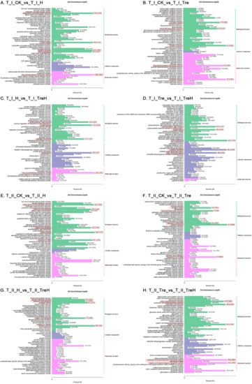 GO enrichment of the DEGs. T—the transcriptome; I—Yangmai 18; II—Yannong 19; CK—control group; H—heat stress treatment for 24 h; Tre—trehalose pretreatment for 3 d; TreH—trehalose pretreatment for 3 d followed by high-temperature treatment for 24 h. The abscissa represents the ratio of the genes annotated to the entry to the total number of annotated genes, and the ordinate represents the name of the GO entry. The label on the right side of the graph represents the category to which the GO entry belongs. The red box represents the top 5 DEG ratios in the figure.
