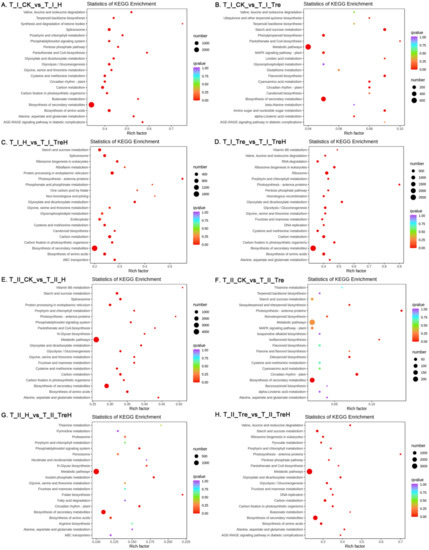 KEGG enrichment of the DEGs. T—the transcriptome; I—Yangmai 18; II—Yannong 19; CK—control group; H—heat stress treatment for 24 h; Tre—trehalose pretreatment for 3 d; TreH—trehalose pretreatment for 3 d followed by high-temperature treatment for 24 h. The ordinate represents the KEGG pathway. The abscissa represents the rich factor. The larger the rich factor, the greater the enrichment degree. The larger the dot, the more the number of differential genes enriched by the pathway. The redder the color of the dot, the more significant the enrichment.