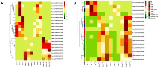 Heatmap of trehalose response candidate genes and transcription factors. T—the transcriptome; I—Yangmai 18; II—Yannong 19; CK—control group; H—heat stress treatment for 24 h; Tre—trehalose pretreatment for 3 d; TreH—trehalose pretreatment for 3 d followed by high-temperature treatment for 24 h. (A) Heatmap of trehalose response candidate genes. The abscissa represents the sample name and the ordinate represents the ID of genes. Red indicates high expression and green indicates low expression. (B) Heatmap of trehalose response candidate transcription factors. The abscissa represents the sample name, and the ordinate represents the ID of transcription factor genes and their families. Red indicates high expression and green indicates low expression.
