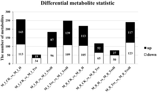 Differential metabolite statistics. M—the metabolomics; I—Yangmai 18; II—Yannong 19; CK—control group; H—heat stress treatment for 24 h; Tre—trehalose pretreatment for 3 d; TreH—trehalose pretreatment for 3 d followed by high-temperature treatment for 24 h.