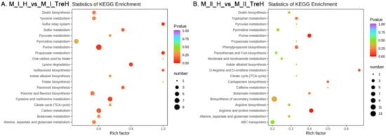 According to the results of differential metabolites, KEGG pathway enrichment was carried out, and it was found that differential metabolites in the M_l_H_vs_M_l_TreH group were mainly enriched in purine metabolism, cysteine and methionine metabolism, carbon metabolism, flavone and flavonol biosynthesis and lysine degradation (Figure 10A). Differential metabolites in the M_ll_H_vs_M_ll_TreH group were mainly concentrated in purine metabolism, biosynthesis of secondary metabolites, arginine and proline metabolism, tryptophan metabolism and phenylpropanoid biosynthesis (Figure 10B). KEGG enrichment analysis revealed that trehalose mainly affected the content of amino acid-related metabolites in wheat under heat stress, and the metabolites of purine metabolic pathway in two varieties of wheat were enriched more, with more significant differences.