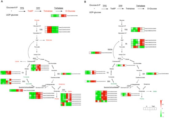 Gene-metabolite integrated analysis network of trehalose, amino acid and tricarboxylic acid cycle (TCA cycle) metabolic pathways. (A) Map of Yangmai 18. (B) Map of Yannong 19. The red words represent the metabolites upregulated and the green words represent the metabolites downregulated. The underlined genes were differentially expressed and their relative expression levels (FPKM value) in two groups (three biological replicates of each treatment) were shown as heat maps. H—heat stress treatment for 24 h; TreH—trehalose pretreatment for 3 d followed by high-temperature treatment for 24 h. Abbreviations: UDP-glucose, uracil diphosphate-glucose; TPS—trehalose-6-phosphate synthase; TPP—trehalose-6-phosphate phosphatase; PGK—phosphoglycerate kinase; PEP—phosphoenolpyruvate; ACLY—ATP citrate (pro-S)-lyase; IDH—isocitrate dehydrogenase; OGDH—2-oxoglutarate dehydrogenase E1 component; SDH—succinate dehydrogenase; FH—fumarate hydratase; GAD—glutamate decarboxylase; GABA—γ-aminobutyric acid; PEPCK—phosphoenolpyruvate carboxykinase; PK—pyruvate kinase.