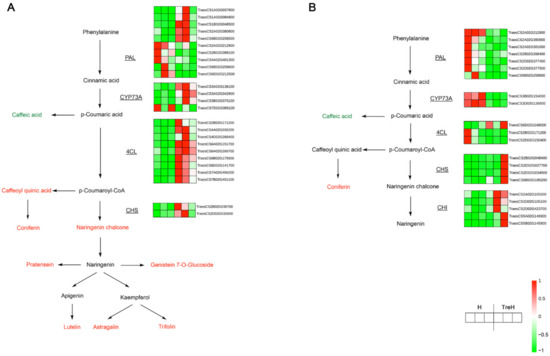 Gene-metabolite integrated analysis network of phenylpropanoid and flavonoid biosynthesis pathways. (A) Map of Yangmai 18. (B) Map of Yannong 19. The red words represent the metabolites upregulated and the green words represent the metabolites downregulated. The underlined genes were differentially expressed and their relative expression levels (FPKM value) in two groups (three biological replicates of each treatment) were shown as heat maps. H—high-temperature treatment for 24 h; TreH—trehalose pretreatment for 3 d followed by high-temperature treatment for 24 h. Abbreviations: PAL—phenylalanine ammonia lyase; CYP73A—trans-cinnamate 4-monooxygenase; 4CL—4-coumaric acid-CoA ligase; CHS—chalcone synthase; CHI—chalcone isomerase.