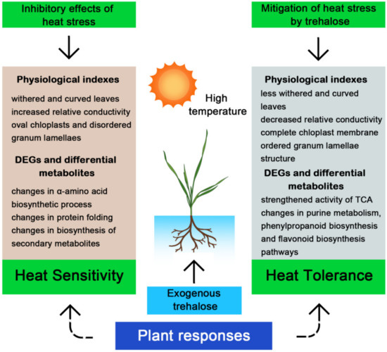 Overall, exogenous trehalose can effectively enhance heat tolerance in wheat seedlings. The underlying mechanism of its mitigation of high-temperature damage was shown in Figure 13.