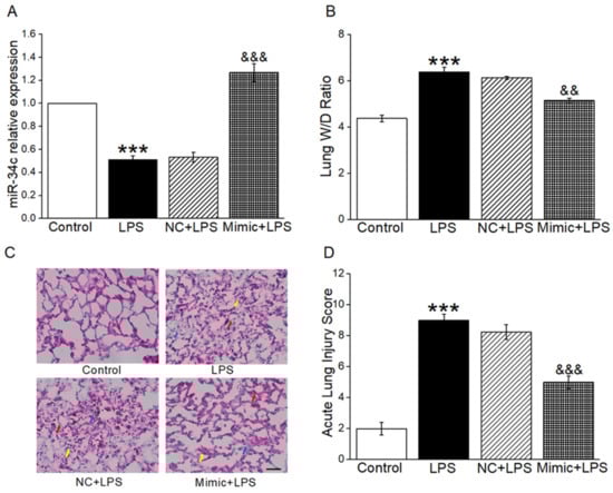 MiR-34c attenuated lung edema and histopathology changes in ALI mouse model. (A) The miR-34c level in mouse lung treated with miR-34c mimic by qRT-PCR assay. MiR-34c level in control (Control), LPS (LPS, 24 h, 5 mg/kg), miR-34c mimics negative control (NC, 72 h, 2 mg/kg) + LPS (24 h, 5 mg/kg) and miR-34c mimics (Mimic, 72 h, 2 mg/kg) + LPS (24 h, 5 mg/kg). The Relative level of miR-34c was calculated as miR-34c/U6 ratios (n = 3–4). (B) The W/D ratio change in LPS-treated mice (n = 4). (C) The effect of miR-34c on histopathology changes was assessed by HE staining (×400). Scale bar = 50 μm. (D) Acute lung injury scores were recorded from 0 (no damage) to 16 (maximum damage). Note: *** p < 0.001, compared with Control group; && p < 0.01, &&& p < 0.001, compared with NC + LPS group.