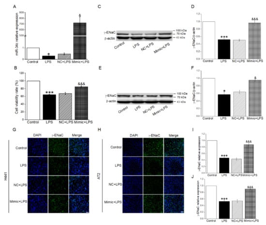 MiR-34c upregulated LPS-inhibited γ-ENaC protein expression in H441 and AT2 cells. (A) MiR-34c relative expression level by qRT-PCR assay in H441 cells treated with LPS for 24 h after the transfection with negative control (NC) or miR-34c mimic (Mimic) for 48 h. The normal medium (Control), LPS (10 μg/mL, 24 h, LPS), NC plus LPS (48 h, NC + LPS) and Mimic plus LPS (48 h, Mimic + LPS) group were performed in H441 cells. The relative level of miR-34c was calculated as miR-34c/U6 ratios (n = 4). (B) MiR-34c enhanced the cell viability in LPS-treated H441 cells by CCK-8 cell viability assay (n = 4). (C,E) Representative blots of γ-ENaC protein in Control, LPS, NC + LPS, and Mimic + LPS group in H441 and mouse AT2 cells, respectively. (D,F) Graphical representation of data obtained from Western blot and quantified through gray analysis (γ-ENaC/β-actin) (n = 4). (G,H) Immunofluorescent detection of γ-ENaC protein in H441 cells and AT2 cells. Nuclei were counterstained by 4,6-diamidino-2-phenylindole (DAPI, blue; left panel) and γ-ENaC (green; middle panel). The merged images are seen (right panel). Scale bar = 50 μm. (I,J) Graphical representation of data obtained from immunofluorescent detection and quantified through gray analysis in H441 cells and AT2 cells (n = 4). Note: * p < 0.05, *** p < 0.001, compared with Control group; & p < 0.05, &&& p < 0.001, compared with NC + LPS group.