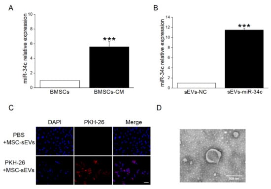 The sEVs derived from BMSCs could be taken into recipient cells. (A) The qRT-PCR analysis of miR-34c levels in BMSCs and BMSCs-CM (n = 4). (B) MiR-34c levels in miR-34c-overexpressing sEVs (sEVs-miR-34c) or empty vector sEVs (sEVs-NC) (n = 4). (C) Immunofluorescent detection of sEVs labeled with PKH26 after incubation with H441 cells for 20 h. Nuclei were counterstained by DAPI (blue; left panel), and the representative staining images are shown in PKH26-labeled sEVs (red; middle panel). The merged images are seen (right panel). Scale bar = 50 μm. (D) Morphology of BMSC-sEVs observed under TEM. Scale bar = 100 nm. Note: *** p < 0.001, compared with BMSCs group and sEVs-NC group.