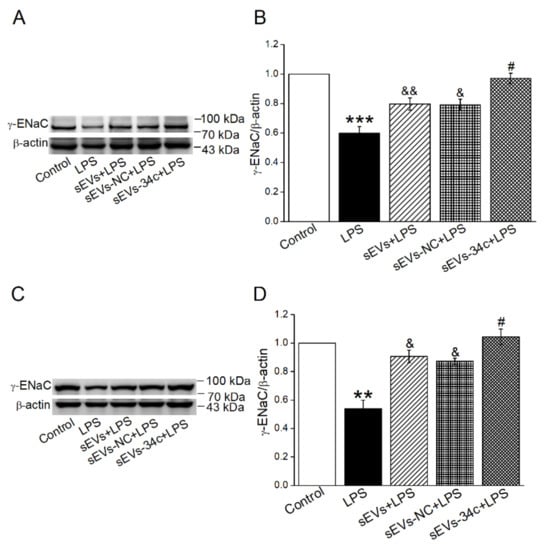 Overexpressing miR-34c in BMSC-sEVs attenuated LPS-inhibited γ-ENaC expression in H441 and mouse AT2 cells. (A,C) Representative blots of γ-ENaC protein in Control, LPS (LPS, 24 h, 10 μg/mL), sEVs (20 h, 20 μg/mL) +LPS (24 h, 10 μg/mL), sEVs -NC (20 h, 20 μg/mL) + LPS (24 h, 10 μg/mL) and sEVs -34c (20 h, 20 μg/mL) + LPS (24 h, 10 μg/mL) group in H441 and AT2 cells, respectively. (B,D) Graphical representation of data obtained from Western blot and quantified through gray analysis (γ-ENaC/β-actin) (n = 5). Note: ** p < 0.01, *** p < 0.001, compared with Control group; & p < 0.05, && p < 0.01, compared with LPS group; # p < 0.05 compared with sEVs -NC + LPS group.
