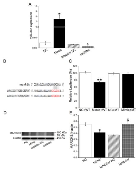 2.5. MiR-34c Increased γ-ENaC Expression by Directly Targeting MARCKS