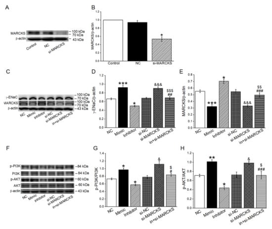 In order to verify whether PI3K/AKT was a downstream pathway of MARCKS in the miR-34c regulating ENaC, we measured the γ-ENaC, MARCKS, p-PI3K/PI3K and p-AKT/AKT protein expression in H441 cells transfected with miR-34c mimic (Mimic), miR-34c inhibitor (Inhibitor) and MARCKS-siRNA (si-MARCKS), respectively. The siRNA transfection efficiency was identified by the Western blot method, and we found that the MARCKS protein expression was efficiently reduced (Figure 6A,B). The expression of γ-ENaC, p-PI3K and p-AKT was obviously upregulated after the transfection of the miR-34c mimic or si-MARCKS, while an opposite result was found in the Inhibitor group and reversed by co-transfection with si-MARCKS (in + si-MARCKS). There was no significant difference among the levels of PI3K and AKT in each group. Moreover, MARCKS expression showed an opposite direction in each group compared with γ-ENaC expression (Figure 6C–H). Hence, the upregulation of miR-34c or downregulation of MARCKS could activate the PI3K/AKT signaling pathway, which might be involved in the miR-34c regulation of γ-ENaC.