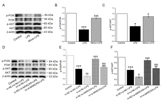 MiR-34c activated the inhibition of PI3K/AKT signaling pathway in LPS-treated cells. (A) Representative Western blot bands of p-PI3K/PI3K and p-AKT/AKT in LPS-treated H441 cells transfected with miR-34c mimic. (B,C) Graphical representation of data obtained from Western blot assays for p-PI3K/PI3K and p-AKT/AKT. Bands were quantified by using gray analysis (p-PI3K/PI3K and p-AKT/AKT) (n = 4). (D) Representative Western blot bands of p-PI3K/PI3K and p-AKT/AKT in LPS-treated H441 cells transfected with miR-34c inhibitor and si-MARCKS. (E,F) Graphical representation of data obtained from Western blot assays for p-PI3K/PI3K and p-AKT/AKT. Bands were quantified by using gray analysis (p-PI3K/PI3K and p-AKT/AKT) (n = 4). Note: * p < 0.05, *** p < 0.001, compared with Control; & p < 0.05, && p < 0.01, &&& p < 0.001, compared with LPS and in-NC + si-NC + LPS; ## p < 0.01, ### p < 0.001, compared with in + si-NC + LPS; $$$ p < 0.001, compared with in-NC + si-MARCKS + LPS.