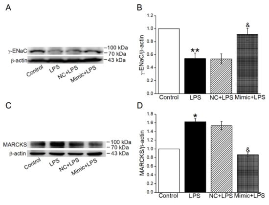 MiR-34c could enhance γ-ENaC expression and inhibit the MARCKS expression in ALI mouse model. (A,C) Representative blots of γ-ENaC and MARCKS protein in Control, LPS, NC + LPS and Mimic + LPS group in ALI mouse model, respectively. (B,D) Graphical representation of data obtained from Western blot and quantified through gray analysis (γ-ENaC/β-actin and MARCKS/β-actin) (n = 4). Note: * p < 0.05, ** p < 0.01, compared with Control group; & p < 0.05, compared with NC + LPS group.