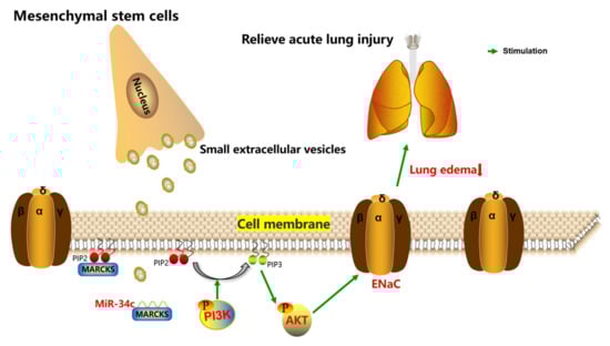 The schematic diagram depicts the potential mechanism about how sEVs derived from MSCs exert their effects on ALI treatment by delivering miR-34c. MSCs can secrete sEVs to transfer miR-34c into alveolar epithelial cells, and miR-34c upregulates ENaC through binding with MARCKS and activating the PI3K/AKT pathway; it also possibly protects against ALI by relieving lung edema. ENaC, epithelial sodium channel; MARCKS, myristoylated alanine-rich C kinase substrate; PI3K, phosphatidylinositol 3-kinase; AKT, protein kinase B; PIP3, phosphatidylinositol 3,4,5-trisphosphate; PIP2, phosphatidylinositol 4,5-bisphosphate.