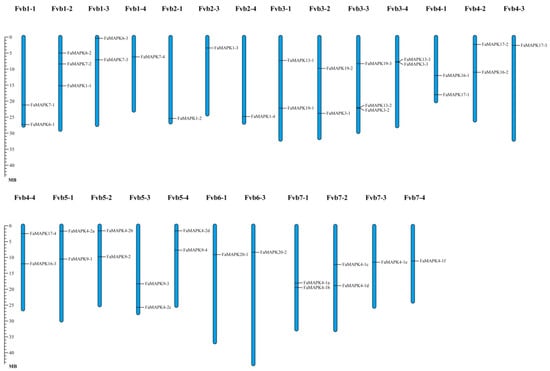 Chromosomal localization of the FaMAPKs. The chromosome number is indicated at the top of each chromosomal. The Fvb2-2, Fvb6-2 and Fvb6-4 chromosomes without FaMAPK gene localization are not showed.