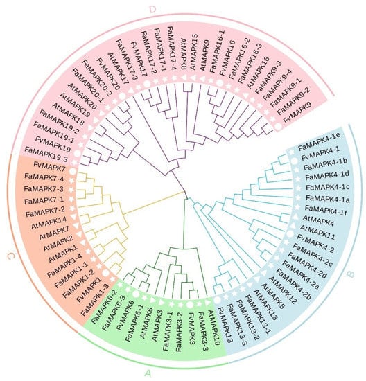 MAPKs belong to the serine/threonine-protein kinase family. At present, the functions of MAPK genes have been well studied in Arabidopsis, rice, maize and other plants. However, there is little knowledge on the role of the MAPK gene family in cultivated strawberry, which is one of the most popular fruits, well known for its nutritional value and unique flavor. In this study, we identified a total of 43 MAPK genes in cultivated strawberries, which is greater than the number of identified MAPK genes in any other plant species, such as Arabidopsis (20 genes) [], rice (15 genes) [], wild strawberry (12 genes) [], barley (20 genes) [] and Fagopyrum tataricum (16 genes) []. Multiple sequences alignment and phylogenetic tree analysis showed that the FaMAPK family members could be classified into four groups based on TXY motifs. Groups A, B and C contained a TEY amino acid motif, while group D contained a TDY amino acid motif. A close genetic association was found between cultivated and wild strawberries in terms of MAPK genes and demonstrated consistent subgroups division [], indicating that MAPK members in strawberries are relatively conservative in evolution. During the long evolution of plants, many genes have either expanded or contracted. There are reports showing a number of plant species that retained some characteristics of their common ancestors and also developed their own unique characteristics. However, the gene number of each group varies within different species, and group D was demonstrated to have the largest number of members. Here, we found that the number of group B members in cultivated strawberries was significantly greater than other species, suggesting that this group had undergone significant expansion through the evolution of cultivated strawberries. These may have contributed to the ability of strawberries to adapt to significant environmental changes and retain a key role in plant adaptation.