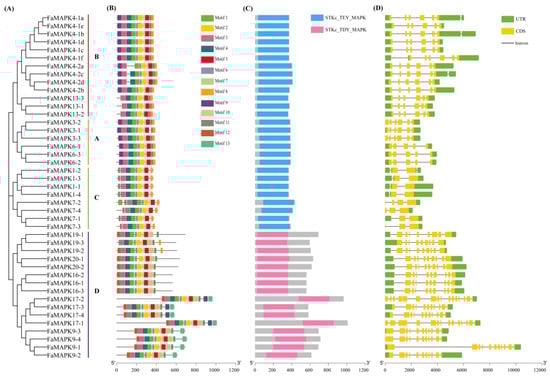 Phylogenetic relationships, conserved protein motifs and gene structure analysis of FaMAPK genes. (A) Phylogenetic tree of FaMAPK gene family. (B) Distribution of motifs of FaMAPK proteins. (C) The conserved domains in FaMAPK proteins. (D) Exon–intron structure of FaMAPK genes.