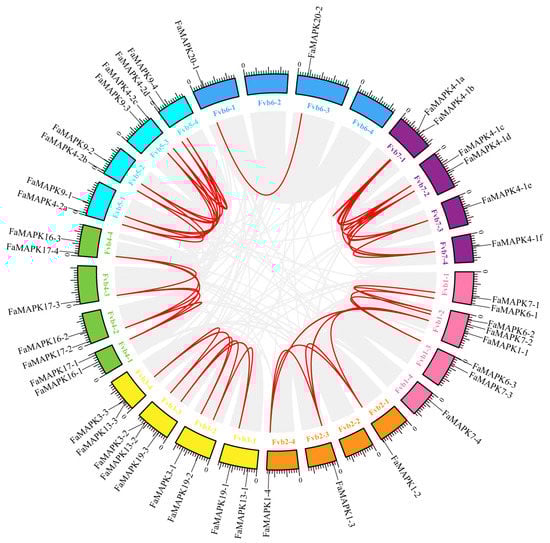 Segmental duplication and synteny analysis of FaMAPKs. Chromosome of cultivated strawberry was distinguished by different color. Each FaMAPK gene is marked with a short line on the chromosome, and the red curve indicates a collinear gene pair.