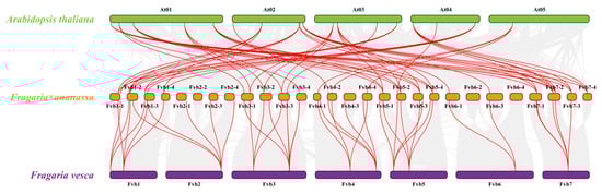 Collinearity analysis of MAPK genes among Arabidopsis, F. × ananassa and F. vesca genomes. Colored circular rectangles denote the chromosomes of three plants. Grey curves indicate collinear blocks within the genomes, and the red curves represent gene pairs that are collinear with MAPK genes.