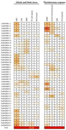 Analysis of cis-regulatory elements in the promoter regions of FaMAPK genes. The figures indicate the number of each cis-regulatory element in the promoter region (1.5 kb upstream of the translation start site) of the FaMAPK genes. Based on functional annotations, the cis-regulatory elements can be classified into two major classes: phytohormone response-related, and abiotic and biotic stresses-related cis-elements.