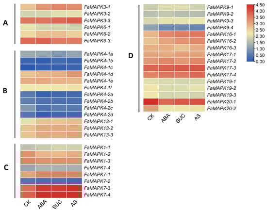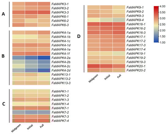 To investigate the role of MAPK genes during fruit development, we examined the developmental expression pattern of the FaMAPK genes. We observed that all FaMAPK genes were expressed in the developmental stages (Figure 7). Most of the FaMAPK genes were highly expressed, especially in groups A and D. FaMAPK3-3, 7-4, 16-1, and 20-1 demonstrated the highest expression, while FaMAPK4-2a, 4-2b, 4-2c, and 4-2d demonstrated the weakest expression. The gene expressions of homologous gene pairs were similar.