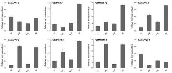 After ABA treatment, the expression of four genes, including FaMAPK7-4, 9-3, 13-3 and 17-2, was significantly upregulated compared with control, whereas that of FaMAPK4-1d and 7-4 increased under the sucrose treatment (Figure 10). In addition, the relative expression of six genes, except for FaMAPK1-3 and 20-1, was highly expressed under the ABA plus sucrose treatment. The expression of FaMAPK 20-1, only under ABA treatment, was decreased. Overall, the results of RNA-Seq and qRT-PCR analysis were consistent, suggesting that the FaMAPK genes may be involved in the developmental and ripening processes of cultivated strawberries.