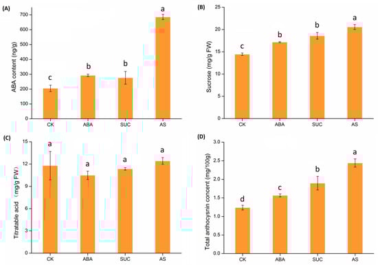 The ABA, sucrose and total anthocyanin content in strawberry fruits varied with different treatments, and the difference in the content of titratable acid among these treatments was not significant (Figure 11). The highest ABA content in the fruits was found in the ABA plus sucrose treatment, followed by ABA-only and sucrose-only treatments. The ABA content in all treatment groups was all significantly higher than in the control group. The sucrose content demonstrated the same variation trends as ABA content, with the sucrose content under ABA plus sucrose treatment being higher than that under ABA or sucrose treatments. Compared with control, the total anthocyanin content increased significantly in response to ABA, sucrose, and ABA plus sucrose. The difference in total anthocyanin content between the three treatments was highly significant.