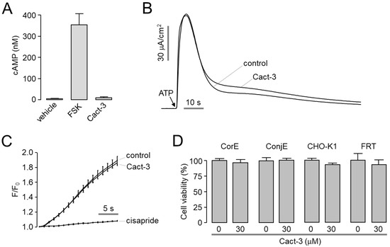 Effect of Cact-3 on cytosolic cAMP level, ANO1, hERG, and cell viability. (A) cAMP accumulation was measured in CHO-K1 cells. Cells were treated with forskolin (20 µM) and Cact-3 (30 µM) for 10 min (mean ± S.E., n = 3). (B) Representative traces of apical membrane currents in FRT-ANO1 cells. Cact-3 was pretreated 10 min prior to activation of ANO1 by ATP (100 μM). (C) Effect of Cact-3 on hERG activity was measured using FluxOR assay in recombinant HEK293 cell line expressing hERG (mean ± S.E., n = 6). Cact-3 (30 μM) and cisapride (50 μM, a hERG inhibitor) were pretreated for 10 min. (D) CorE and ConjE cells were treated with 30 µM Cact-3 for 48 h and then cell viability was assessed by MTS assay (mean ± S.E., n = 6).