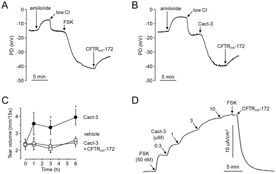 To observe the effect of Cact-3 on the CFTR channel activity on the ocular surface of a mouse, we measured the open-circuit potential difference (PD) across the ocular surface of ICR mice. As shown in Figure 4A,B, representative traces of ocular surface PD showed a small amiloride-induced depolarization followed by a low Cl− perfusate-induced hyperpolarization and the subsequent activation of CFTR by forskolin (20 µM) and Cact-3 (30 µM). The application of CFTRinh-172 inhibited the forskolin- and Cact-3-induced hyperpolarization. To investigate the effect of Cact-3 on tear secretion in mice, the tear volume was measured using phenol red thread in mice. Cact-3 significantly increased the tear volume by >1.5 times from 3 to 6 h after the treatment and the Cact-3-induced tear volume increase was completely blocked by CFTRinh-172 (Figure 4C).