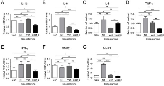 Cact-3 reduced expression of proinflammatory cytokines of cornea and conjunctiva in a scopolamine-induced dry eye mouse model. The relative mRNA expression level of IL-1β (A), IL-6 (B), IL-8 (C), TNF-α (D), IFN-γ (E), MMP-2 (F), and MMP-9 (G) in cornea and conjunctiva were presented. Dry eye mice were treated with vehicle or Cact-3 for 10 days whilst maintaining the dry eye condition (mean ± S.E., n = 4). NT: not treated; ns: not significant. * p < 0.05; ** p < 0.01; *** p < 0.001.